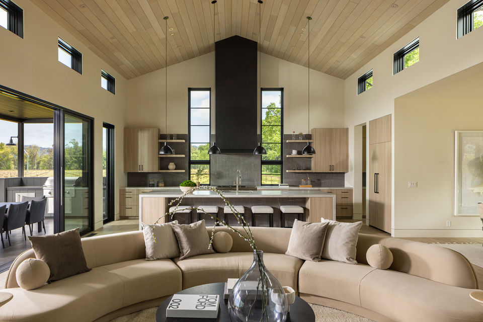 The great room is a dramatic yet inviting space, defined by wood-paneled vaulted ceilings, clerestory windows, and panoramic vineyard views. A sculptural fireplace clad in modern tile anchors the living area, while oversized glass sliders blur the line between inside and out. The open layout flows seamlessly from the kitchen to the main living area. Just off the great room, the dining area provides an intimate setting framed by large picture windows, while a nearby office or den offers a quiet and flexible space for work or retreat.